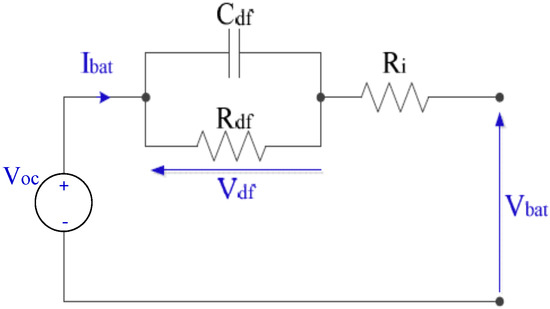 Battery modeling is an important research field because of their expanding use and the need to reproduce and simulate the physical behaviors of the battery. Much research is being carried in modeling, so that we can have accurate monitoring of Li-ion batteries dynamically. Researchers of batteries have developed a wide range of battery models with varying degrees of complexity. Therefore, to consider the real-time applications, the first-order model is utilized in this paper, which has been widely used for its good characteristics in terms of accuracy and complexity [26,36,37]. This battery model is composed of a voltage source representing the open circuit voltage, an ohmic resistance that models the internal resistance and a one polarization RC network that describes the polarization phenomena.The RC branch is composed of the capacitance , representing the polarization of the metallic electrodes, and the resistor , which is due to the contact of the electrodes with the electrolyte [25]. This model is given by Figure 1, where is the battery charge or discharge current and is the battery terminal voltage.