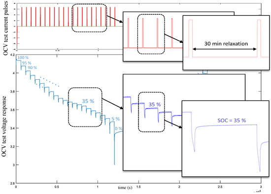 Actually, the OCV test consists firstly of the complete charge of the battery, then we apply discharging current pulses corresponding to 5% of the SOC step intercepted by a 30-min rest time to fully discharge the cell. The rest time is crucial because it allows the battery to reach the equilibrium at a stable value of OCV. Then, we extract the OCV points at the 21 different SOC levels to trace the curve mapping between OCV and SOC meant to be modeled analytically. This setup is then repeated in the charge phase.