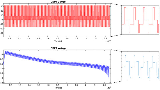 Another test is then needed for the validation, which is the dynamic discharge pulse (DDP) test [23]. The DDP test consists of a series of charge and discharge pulses applied on the battery until the cut-off voltage. It is created to evaluate the effectiveness of the battery model during the dynamic solicitation. Figure 6 illustrates the DDP test current profile and its voltage response, which represents the dynamic discharge behavior.