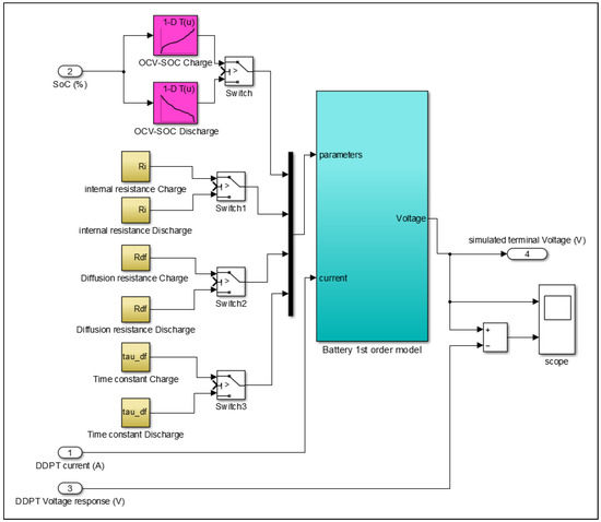 Figure 7 gives the Simulink schematic of the battery model used for validation; in this model, all of the parameters are divided into charge and discharge to capture the hysteresis.