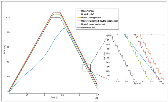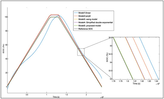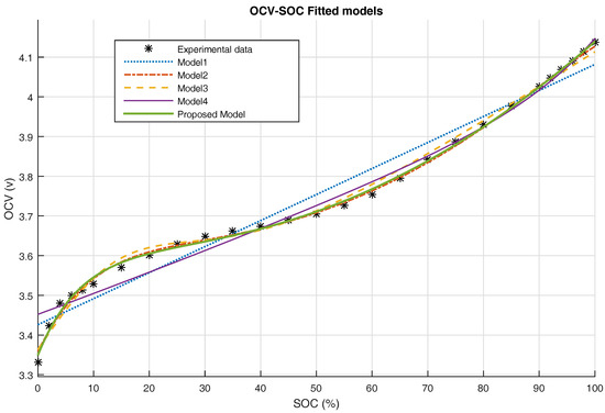 The proposed OCV model is compared in this section with the four different other models summarized in Table 4. The fitted OCV-SOC curves are plotted in Figure 9.