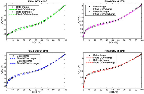 Fitting the proposed model to OCV data recorded from the NMC 20-Ah battery cell at different temperatures (5, 15, 25, 45 °C) shows high accuracy, as illustrated in Figure 10.