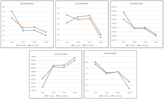 The obtained parameters of the OCV model at the characterization temperatures should be interpolated to be used in intermediate temperatures values. In Figure 11, we have considered a linear interpolation for each parameter of the model at the four known temperatures (5°, 15°, 25° and 45°) in both charge and discharge. Therefore, the model for other unknown temperatures outside of the characterization ones can be given by a simple projection. The dependencies of all of the model parameters on the temperature are illustrated in Figure 11.