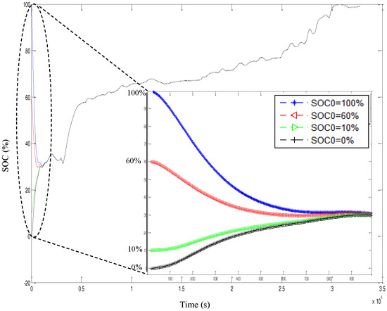 Applying the EKF to the battery system proves this and can be shown in Figure 14. Assuming that we are estimating the SOC of the cell full charge from 0%–100%, we used four different , and we observed that the algorithm converges and gives a reliable estimation; indeed, the closer the initial random is to the real initial SOC, the faster the algorithm is converging.