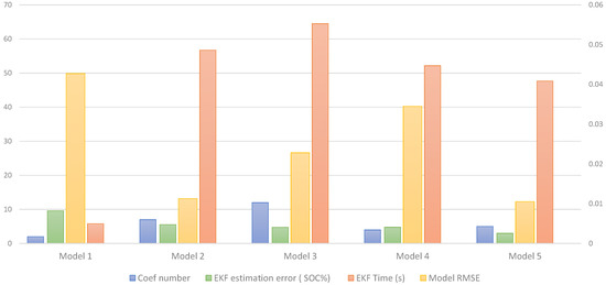 To summarize all of the studied models’ performances, we grouped all metrics to have a global comparison in Figure 17. In fact, Model 5, which is the proposed model, presents the best compromise. This OCV model is very reliable from a precision point of view, since it has the best fit, and the RMSE is about 0.01 V; and also the best SOC estimation precision since the error is almost about 3%. Additionally, from an implementation point of view, it is also the most adequate.
