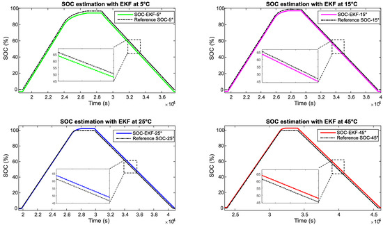In fact, when applied to different pulsed profiles at various temperatures (5, 15, 25, 45 °C), the algorithm shows a good accuracy reported in Table 11, where the EKF error precision compared to the real SOC given by the Coulomb-counting is almost 3% as an average value. All of the experimental results are illustrated in Figure 18.