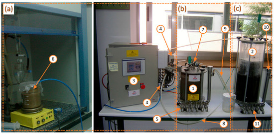 The experimental CSTR-type digester (Continuous Stirred Tank Reactor) consisted of a 6 L tank mixed by means of forced convection of methane produced in the anaerobic digestion (Figure 1 and Figure 2). The digester was primed with a suitable volume of anaerobic sludge from the Badajoz sewage treatment plant. The components of the digester were as follows: