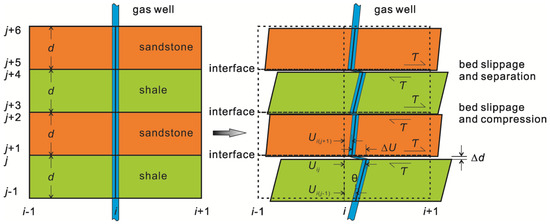 where, Ux is the intra-strata elastic shear offset; ΔU is interlaminar relative shear offset; Tx = Ux + ΔU is total offset and is normalized over the bed thicknesses; d and Δd separately refer to SRLT and the vertical separation distance between layers (Δd > 0 indicating delamination (bed separation), while Δd < 0 indicating compression); Uij denotes the lateral shear offset of node (i, j), with a similar meaning for Ui(j − 1) and Ui(j + 1).