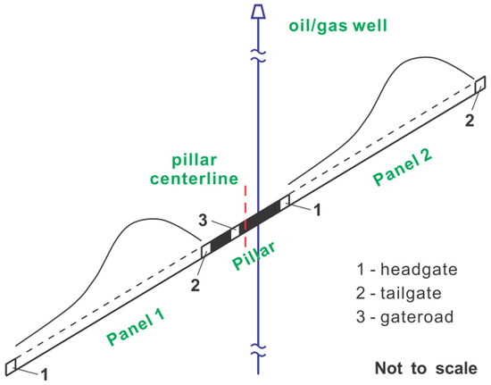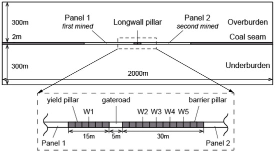 The geological setting of coal mines in southwest Pennsylvania (e.g., Cumberland, Emerald, and Clyde), is assumed in this study as a comprehensive description of coal measure rocks, worldwide. In recent years, the three-entry system (two rows of protective pillars) has gained dominance in the longwall panel designs in this region. Mining activities at the above coal mines are primarily performed in the Pittsburgh coal seam, which is 1.5–2.5 m in thickness. At a depth of 280 m, the seam is near horizontal. Longwall mining and room-and-pillar mining are widely employed by coal mines in this area, with longwall mining producing over 80% of the coal. A longwall panel is typically 350–450 m wide and over 2000 m long, with the longest panels reaching 4000 m. In general, a 50 m wide chain pillar, termed a protective pillar for hydrocarbon wells in this study, is reserved between the two adjacent longwall panels. This chain pillar is separated by a 5 m wide gate road into two parts, namely a 15 m wide yield pillar and 30 m wide barrier pillar, as shown in Figure 2.