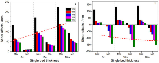 In these, the left plot (a) and right plot (b) separately represent the deformation magnitudes after the removal first of panel 1 on the left side and then the removal of the second panel on the other side. The peak horizontal shear offset at the weak interface between soft and stiff layers is positively correlated to SRLT (Figure 3a). After the removal of panel 1, the peak horizontal shear offsets (all single-sensed shear displacements) of various wells grow approximately linearly with increasing SRLT. When SRLT doubles, peak horizontal shear offsets of the various wells less than doubles and grows by only ~40–70%. The closer the candidate well to the first mined panel, the larger the shear offset it undergoes.