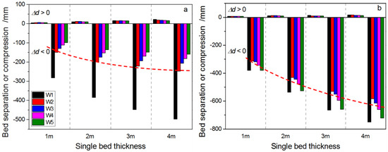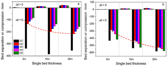 Figure 4 shows that vertical compression dominates over bed separation. Either after the extraction of one panel (Figure 4a) or of both panels (Figure 4b), the vertical delamination and compression of various wells rises approximately logarithmically with increasing SRLT. When SRLT is small (5 m) the flexural stiffness of the rock layer is small. As a result, the adjacent rock layers are more conducive to bending and distortion. Therefore, after the removal of only the first (left) panel, the peak delamination is only 3 mm (scenario I-1, W1). However, when SRLT increases to 10 m and 20 m, the flexural stiffness of the rock layer increases, leading to degraded compatibility between adjacent rock layers. As a result, delamination increases, with the peak delamination reaching 12 mm (scenario I-2, W2) and 21 mm (scenario I-3, W2), respectively (Figure 4a).