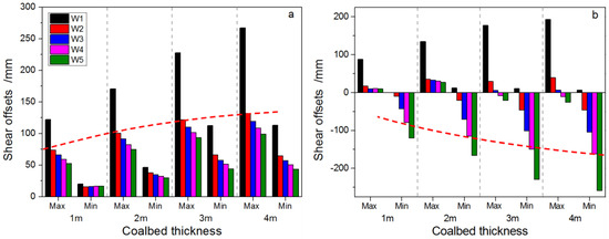 Increasing SMH creates larger mine openings, allowing greater strata movement and inducing greater overburden deformation. Therefore, increasing SMH is more damaging to the stability of small-diameter hydrocarbon wells vertically drilled through longwall mining areas. To examine the effect of SMH on various well deformations, four mining scenarios (scenarios II-1–II-4) are explored. With a fixed burial depth of 300 m, seam thickness in these four scenarios is set as 1, 2, 3 and 4 m, respectively. Figure 5 and Figure 6 separately show the extreme value statistics of lateral shear offsets of the hydrocarbon wells and bed separation or compression along various well trajectories after the twin panels are removed sequentially (for various SMHs).