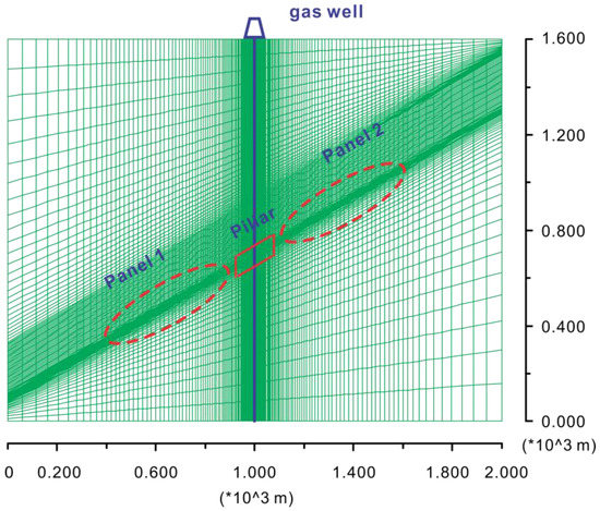 When the coal seam is inclined, shear slippage between various rock layers is promoted. Also, both the shear force and frictional force at the interface are correlated to SDA. We explore the influence of SDA on well deformations in a third study group (scenarios III-1–III-4). We define flat coalseams, nearly flat coalseams, gently inclined coalseams and inclined coalseams, as having SDAs of 0°, 8°, 16.7°, and 31°, respectively. The non-integer angle is taken for the sake of convenient mesh generation. Considering that most of the peak shear offsets of wells occur within the strata that are dozens of meters above the coalseam [3], we only include interface elements between layers that lie within 200 m above the coalseam. The specifc 2D FLAC model is given in Figure 7, with a dip angle of 31° as an example. In each scenario, the vertical distance from the center point of the pillar to the model upper boundary (suface) is 900 m. The panels are set up along dip, advancing along strike (along the axis vertical to the paper view). Extraction occurs of the downdip panel (panel 1) prior to the updip side (panel 2).