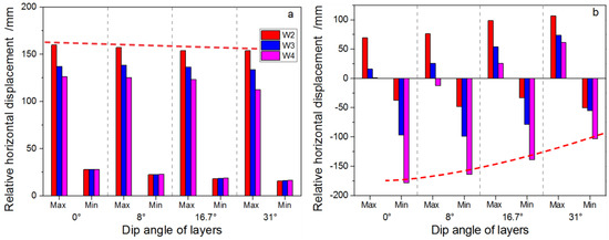 Shear slippage occurs along the inclined interface between neighboring soft and stiff layers after the removal of the first panel (Figure 8a). The resulting maximum relative horizontal displacements (all single-sensed shear displacements) of well trajectories W2–W4 decrease gently with rising SDA. Therefore, the relative horizontal displacements at interfaces after the extraction of the downdip panel (panel 1) can be considered irrelevant for SDA (0–30°). After the extraction of both panels, the effect of SDA on relative horizontal displacements of various wells varies from the location of the well. More specifically, for well trajectory W2, which is closer to the first mined panel, the peak relative horizontal displacement is still positive; while for well trajectories W3 and W4 that are closer to the later removed panel, the peak relative horizontal displacements reverse to negative. The peak relative horizontal displacement of well trajectory W2 (positive) increases and the peak displacements of well trajectories W3 and W4 (negative) decrease in an approximately logarithmic manner as SDA grows (Figure 8b).