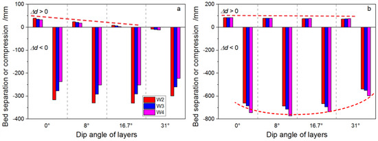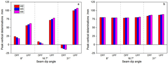 The peak vertical delaminations that occur at interfaces between neighboring beds are larger as the updip panel is mined first, irrespective of SDA (Figure 14a). After the removal of panels on both sides, however, the difference in vertical delaminations in magnitude between these three wells are minimal regardless of whether the updip or downdip panel is removed first (Figure 14b). It is concluded that the effect of mining sequence on the axial tensile deformation of the well is mainly manifest during extraction of the first panel. Therefore, from the perspective of effective control of tensile deformation of wells, extraction of the downdip panel prior to the updip side also favors the stability of hydrocarbon wells. In addition, Figure 12 and Figure 14 also demonstrate that, when the downdip panel is mined first, the tensile-induced vertical delamination between layers gradually shifts to compression (Figure 14a) as SDA increases. For example, when SDA is 31°, vertical delamination is not observed within the strata above the pillar after only the downdip panel is removed. Significant vertical delamination at interfaces between beds only occurs after the twin panels are both mined.