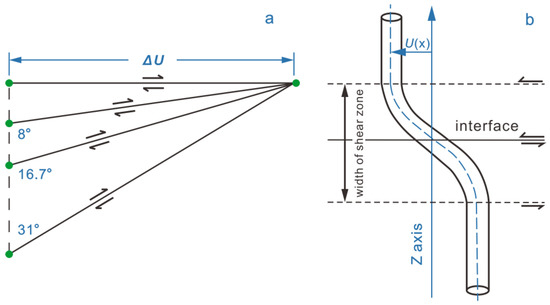 A well would likely not survive an offset greater than its diameter if applied over a short distance—but a relative offset of some fraction of a well diameter could likely be survived—depending on the length over which the distortion is applied. Therefore, given the maximum relative horizontal displacements induced by the slippage of rock layers along the inclined interface, it is considered that increasing SDA is not likely to elevate the risk of shear-induced failure of the well after only the downdip (deep) panel is mined (Figure 8a). In contrast, the final peak relative horizontal displacement of the well resulting from sequential removal of the twin panels decreases with rising SDA (Figure 8b). In other words, risk of shear failure of the well wholly resulting from horizontal shear offset decreases after the twin panels are removed. However, there is a fixed relation in magnitude between the same horizontal shear offset ΔU and its corresponding shear offset along the inclined interfaces (Figure 10a). With a constant ΔU, shear offset along the inclined interface increases with rising SDA. As a result, shear-tensile and shear-compression along inclined interfaces between beds (interbedded distortion) elevate, making the well more prone to S-shaped shear failure (or distortion failure, Figure 10b).