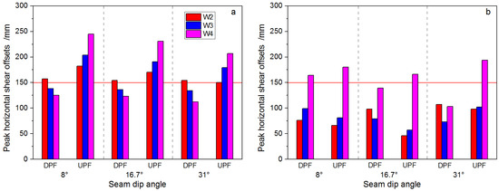 Peak horizontal shear offsets of well trajectories W2–W4 for longwall mining along strike after only one panel (a) and then both panels are removed (b) in cases of different extraction sequence. “DPF” represents the downdip panel is removed first and then the updip panel. “UPF” represents the updip panel is removed first and then the downdip panel.