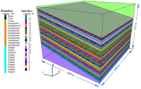 Strata overlying the Pittsburgh coal seam mainly comprise layered strong sandstone and limestone and relatively weak shales [35,36]. The stratigraphic column, extrapolated from three typical geological boreholes indicates that single rock layers within the strata are mainly 3–23 m thick, among which hard/stiff layers (sandstone and limestone) have an accumulative thickness that accounts for 33–45% in total strata thickness. Therefore, the following simplifications are made in the numerical model: (1) the strata are comprised of alternating soft and stiff layers; (2) the soft layer and stiff layers are in the proportion 50% and 50% in height, separately.