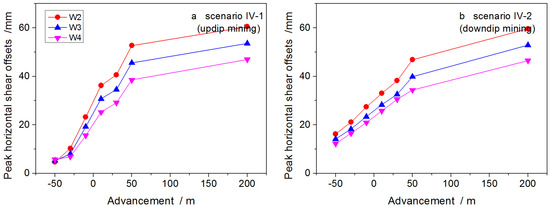 Dynamic evolution of peak horizontal shear offsets of well trajectories W2–W4 as the longwall panel advances (a) updip and (b) downdip. The abscissa represents the horizontal distance between the well and the working face after each stage of excavation. Negative magnitudes indicate that the advancing face is ahead of the well and positive magnitudes indicate that the face has passed the well.