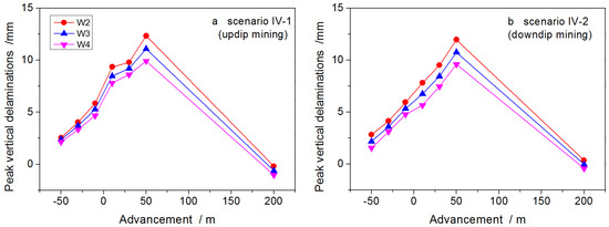 Scenarios IV-1 and IV-2 simulate updip and downdip mining, separately. Analysis is also performed on the deformation of well trajectories W2–W4. As the panel advances along either updip (Figure 16a) or downdip (Figure 16b), the peak horizontal shear offset initially rises rapidly and asymptotes. The peak horizontal shear offsets for well trajectories W2–W4 in the two scenarios show slight differences in magnitude and evolution, indicating that downdip and updip mining have similar effects on shear deformations of the well as the SDA is no greater than 12°. The peak vertical delamination at weak interfaces between beds undergoes a gradual increase prior to a gradual decrease (Figure 17). Similar to the peak horizontal shear offsets, peak vertical delaminations along well trajectories W2–W4, resulting from updip mining (Figure 17a) also resemble those resulting from downdip mining (Figure 17b)—both in magnitude and evolution. These also indicate that updip and downdip mining have similar effects on the axial tensile deformation of wells in longwall mining along dip, with a dip angle of <12°. Consequently, in such circumstances, either the updip or downdip mining is acceptable.