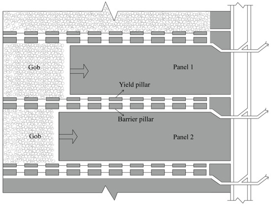 Schematic diagram of the base model (Pillar geometry between the twin extracted panels is shown in the excerpted frame. Panel 1 is removed first and then panel 2 is removed afterwards.).