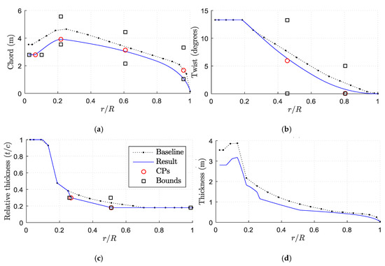 where the subscript ref denotes the reference (or baseline) blade. The vector contains a total of n variables that are real numbers, . The design variables, , are control points (CPs) that define the chord, twist and relative thickness as a function of blade span, see Figure 2. B-splines [29] are used to parameterize the chord and twist distributions, while a linear interpolation is used for the relative thickness distribution. Only four CPs for the chord, two CPs for the twist, and two CPs for the relative thickness distribution are optimized. The total number of variables is then eight. In Figure 2, the CPs for chord vary vertically (i.e., increasing/decreasing chord) and are fixed radially, except for the first CP in the root region. The first CP varies radially but is not fixed vertically. The chord value for the first CP is equal to the minimum chord value needed to achieve a dimensional thickness similar to the baseline blade. CPs for the twist vary vertically and are fixed radially and vice-versa for the relative thickness CPs. The upper (U) and lower (L) notations, , are the upper and lower limits of the CPs, while the non-linear inequality constraint, , is to promote monotonically decreasing chord, twist, and relative thickness at the outboard of the blade. The boundary and non-linear inequality constraints are required to ensure feasible blade designs.