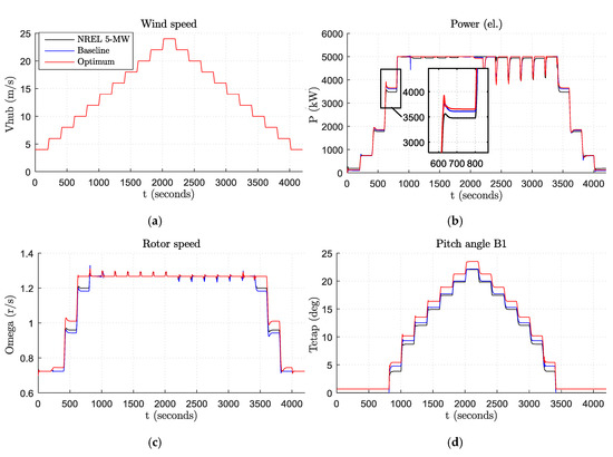 Figure 7 depicts the aeroelastic performance of OffWindChina 5 MW against the reference (or baseline) for a wind sweep between 4 and 24 m/s. The NREL 5 MW performance is included for comparison as well. Figure 7 shows that the optimized design produces more electrical power (top-right) and less thrust (bottom-right) than the baseline design.