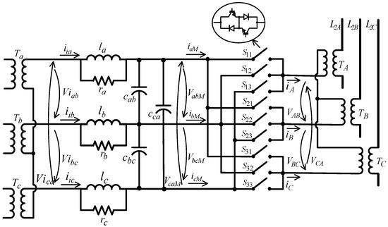Considering a symmetrical and balanced three-phase system, an equivalent per-phase model of a DMC-UPFC transmission system, shown in Figure 3, is obtained, where the voltage sources, the coupling transformers and the DMC are all considered ideal. Based on this simplified circuit, the dynamics of three-phase currents ij in the transmission line is: