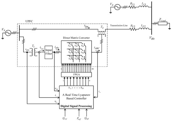 Direct matrix converters (DMCs) are alternative power converters to DC-link back-to-back connected inverter-rectifier with capacitive energy storage. Therefore, DMCs can be advantageously used in unified power flow controllers (UPFCs). UPFCs emerged in the 1990s by L. Gyugyi as the most versatile FACTS (Flexible AC Transmission Systems) equipment [1,2]. FACTS technology uses power electronic devices—namely power semiconductors—with turn-off capability associated to their firing circuits and modern control techniques to enforce the active and reactive power in electrical systems. These power controllers work in real time to regulate the energy transit in the transmission lines up to its thermal limits [3].