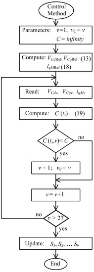 The real time Lyapunov-based controller (Figure 4) algorithm, implemented in a digital signal processor, is presented in the flowchart in Figure 5. As shown in the diagram, the control method main loop calculates the values of VCdRef(ts), VCqRef(ts) and iqMRef(ts) once, while the cost functional, C(ts), is evaluated 27 times to find the vector with components VCd(ts), VCq(ts) and iqM(ts) that minimizes the weighted cost functional. This selects the space-vector which minimizes the cost functional, and is applied to the DMC-UPFC in the following sampling time (ts + ΔT).