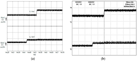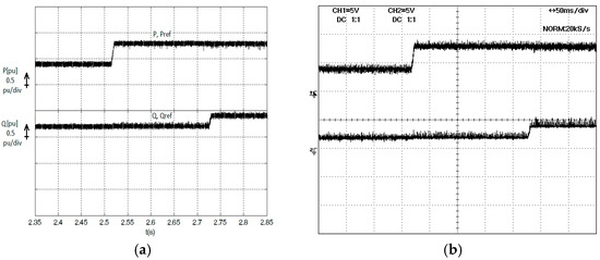 Both results show clearly that there is no cross-coupling between active and reactive power, being both independently controlled, and showing a fast response with a small ripple in steady state. The results of Figure 7a,b are simulation and experimental results, respectively, for the proposed control method, when the same initial conditions as in Figure 6 are retained, but with different time instants. Once again, these results prove the good performance of the power controller.