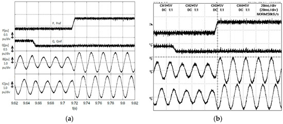 Figure 8a,b show the simulation and experimental results, respectively, of the active and reactive powers, and also the line currents, considering P and Q power step responses to ΔPRef = +0.4 pu and ΔQRef = −0.2 pu, when initial reference values are PRef = 0.4 pu, QRef = 0.2 pu. These results show no cross-coupling, steady-state errors below ripple errors, and fast response times for different changes of power references. Line currents are almost sinusoidal with small ripple content.