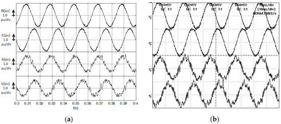Line currents (iB, iC) and input matrix converter currents (ib, ic) for ΔPRef = +0.4 pu and ΔQRef = +0.2 pu: (a) Simulation results; (b) Experimental results (Ch1 = Ch2 = Ch3 = Ch4 =1.0 pu/div).