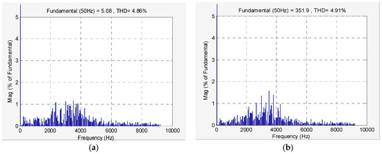 Figure 11a,b show, respectively, the harmonic spectrum of the line current and load voltage. These quantities present a low harmonic content (THD less than 5%) of 4.86% and 4.53%, respectively, which compares favourably with the improved methods proposed in [24] to enhance power quality in matrix converters (the THD of input currents is higher than 6.29% in [24]).