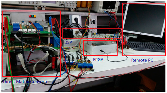 To carry out real-time control of the power in the transmission lines, a real-time DSP board (DS1103 model of dSPACE) with the proposed control algorithm was used to select the suitable vector at every sampling time. The DS1103 was able to execute the vector modulation, control algorithm, and output the 9 DMC bidirectional switch control signals at a sustained sampling time (Ts) of 18 μs. This sampling time is suited to switching the DMC at frequencies around 5 kHz, but is not enough to guarantee safe commutation between the DMC bidirectional switches, as this requires much faster changing signals. Therefore, to ensure safe commutation, the four-step output current commutation strategy was used [18], implemented in a field-programmable gate array (FPGA) using a Xilinx (Virtex 5) board, as represented in Figure 4.