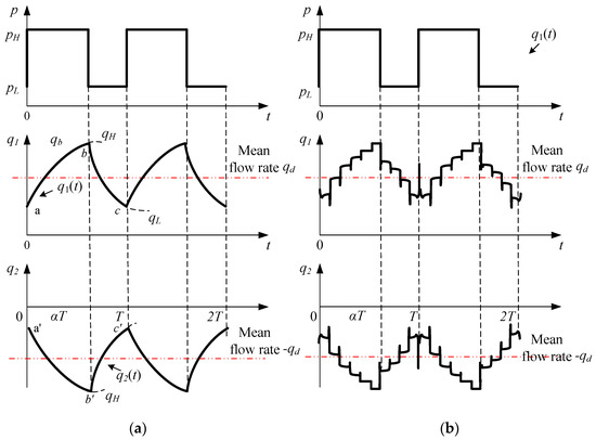 The average flow rate from the HP port corresponds to the sum of the integrals of the expressions in Equation (3) through the one switching period divided by T, given by Equation (5):