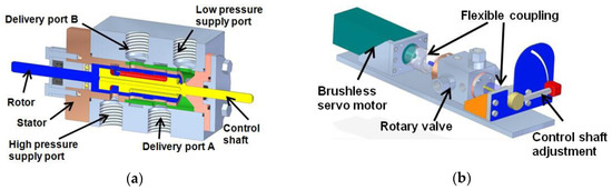 (a) Schematic of the rotary valve; (b) Arrangement of rotary valve and servo motor, adapted from Pan et al. [6], with permission from © 2015 American Society of Mechanical Engineers, 2015 [6].