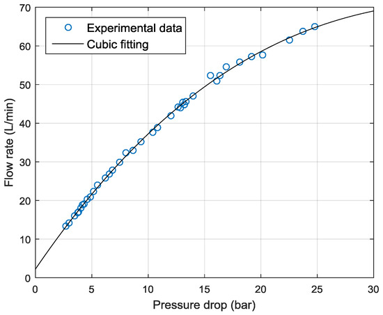 Figure 5 shows the flow-pressure characteristics of the valve orifice when it was fully opened. The oil temperature was 54 °C. The estimated orifice opening is 0.238 cm2, assuming the flow coefficient is 0.6 and the fluid density is 860 kg/m3. The valve is modelled by using the standard orifice equation: