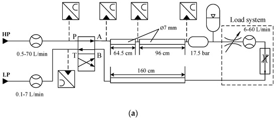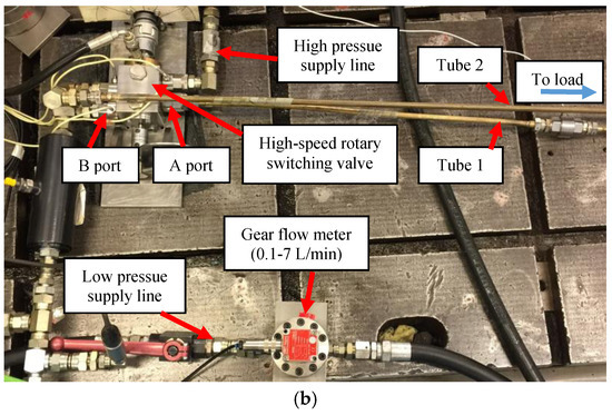 Figure 6 shows the schematic and photograph of the test rig. The system consists of the high-speed rotary switching valve, two inertance tubes (160 cm each) and a loading system comprising a pressure compensated valve and a needle valve. Three accumulators and in-line shock suppressors were used to attenuate pressure pulsations. Three miniature piezoresistive pressure transducers with a range of 200 bar were used to measure the upstream pressure between the switching valve and the tube, the mid-stream pressure at the connection and the downstream pressure. Two further pressure transducers, with ranges of 350 bar and 35 bar were used to measure the HP and LP supply pressures. There was no pressure transducer at the load end of tube 2 so delivery pressure could not be determined directly. Instead the load-end pressure of the tube 2 is estimated using . An xPC Target real-time platform was used for data acquisition and control, and the numerical models are constructed in SIMULINK. Parameters for the distributed analytical and simulation models are listed in Table 1, which are also used for experiments. Details of simulation models can be found in [19].