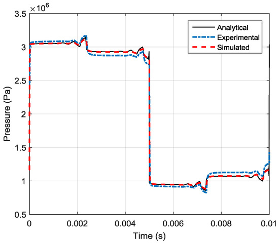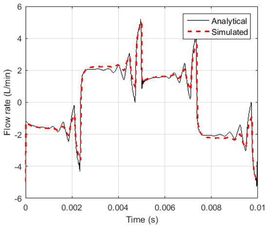 The HP supply was fixed at 32 bar and the LP at 10 bar. To simplify the system and eliminate the effect of resistance, the needle valve was closed, and the delivery flow rate was 0 L/min. This also helped to reduce the consequences of the valve switching transition and cavitation. The pressure at point A between the switching valve and tube 1 is plotted in Figure 7, where the analytical, simulated, and experimental results agree very well. The electrical noise caused by the sensor measurement was filtered. The pressure switched from 31 bar to 11 bar with the switching ratio of 0.5. The wave propagation effect was almost eliminated with this operating condition (switching ratio = 0.5, switching frequency = 100 Hz). As the optimal operating condition is of the 100 Hz switching frequency and the 0.24 switching ratio (Theorem 2, Equation (17)), some oscillations still can be seen in Figure 7 and Figure 8. The high-frequency resonances have not been fully adapted in this case, which may cause high-frequency noise. However, the oscillations decayed rapidly and did not affect system dynamics and stability. The valve switching transition effect was small due to the zero flow rate. Less clear experimental results are expected when the system operates with a high delivery flow rate. Figure 8 shows the inlet dynamic flow rates. As it was difficult to measure the dynamic flow rate accurately due to the limitation of the sensors, the simulated results were used for comparison in this case. However, we are confident in using the simulated flow rates here as the simulated and experimental pressures agreed very well as shown in Figure 7, which indicates that the simulation is able to represent the system dynamics correctly and accurately.