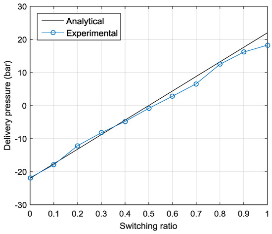 Figure 9 shows the relationship between the delivery pressure and the switching ratio with a switching frequency of 100 Hz. The analytical and experimental results match well and indicate that the delivery pressure has a linear relationship with the switching ratio.