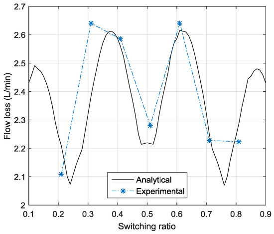 The minimum flow loss occurs when the switching frequency and ratio satisfy Equation (17). Figure 10 shows the analytical and experimental flow loss versus switching ratio with the switching frequency of 100 Hz. Three optimal operating ratios (0.25, 0.5, and 0.75) leading to low flow losses were found, and this was also consistent with Figure 7, where the wave propagation effect was small for a switching ratio of 0.5 [23]. The wave propagation time twave is 2.4 ms.