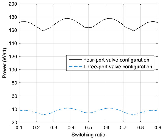 Comparison of power losses between an SIHS in a three-port valve and a four-port valve configuration.