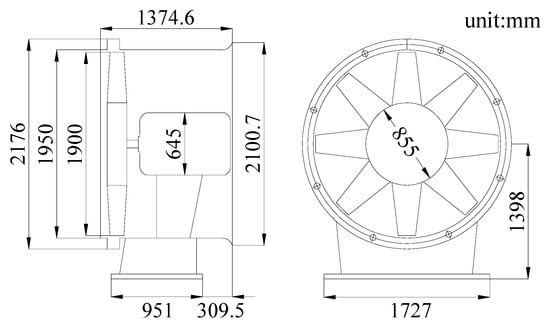 From the description of Section 2.1, we can find that 50 m station played a key role in the ventilation system, which is selected as the physical model. The station consists of two axial flow fans in parallel, and the fan model is K40(B)-19. The fan structure diagram is shown in Figure 2, and its main parameters are provided by the manufacturer as follows: (1) rotating speed of 980 rpm; (2) rated air quantity range from 35 m3/s to 85 m3/s; (3) rated pressure range from 290 Pa to 1300 Pa.