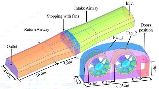 The fan station is located at the position with the widest tunnel size, and the thickness of the stopping construction with fans is 1.3 m, which is basically the same as the length of the fan housing; and the tightness of the stopping is really good, according to the in-site investigation. Double air-doors were set into the stopping with the width of 0.8 m and the height of 1.4 m, and there is only a little or no air across the bulkhead, so it can be negligible to take account of the pressure leakage and effect caused by the bulkhead. The distance between two fans housing is 0.3 m in PFS, the model is established and shown in Figure 3, and the airflow in the PFS has following features: (1) the atmospheric pressure value is 101.26 kPa; (2) the dry and wet bulb temperatures are 30.2 °C and 30.1 °C, respectively; (3) the air density is 1.16 kg/m3; (4) the air quantity and velocity of the inlet are 110.56 m3/s and 8.4 m/s.