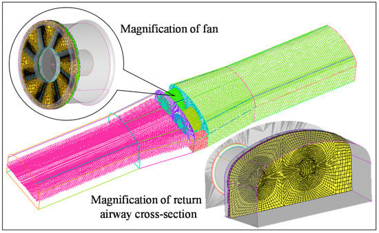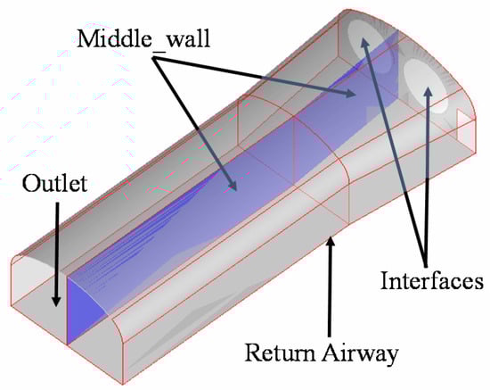 The multiple reference frame (MRF) model is applied to couple the rotating blades and the stationary zone, which is widely employed in fluid machinery and turbo-machinery applications []. Interfaces are well defined to deliver fluid information between the rotating zone (parallel fans) and the stationary zone (the intake and return airways).