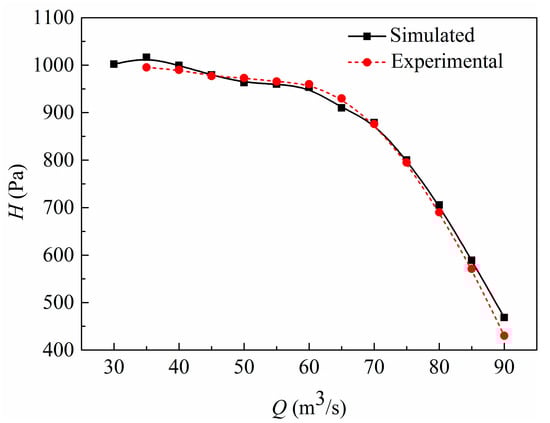 The simulation model is validated by comparing the fan performance with experimental data. It is well known that a certain difference with fan performance existed between single fan and parallel fans operating points, and it was also found that all fan operating points were changing at all times during the in-site experiment, due to the airflow variation of all working faces and the air piston effect in underground mines, especially in the air shaft. For the sake of validating the calculating model, it is determined to compare the fan performance between single fan for the standard condition and the fan curve data in standard fan test, which was given by the fan manufacturer []. Considering that the standard fan test is the C type industrial fan performance testing system [], a certain distance pipeline model with 90° arc entry is established to connect the fan inlet, and the schematic can be referenced from [], and computational method and boundary conditions are the same as thedescription in Section 2.3. A fan characteristic curve with 13 points is achieved by viewing simulation results, and compared with the experimental characteristic curve under standard conditions, as shown in Figure 5.