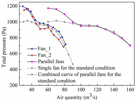 It is set that the air quantity at the inlet varied from 60 to 160 m3/s with 10 m3/s increments []. Figure 6 shows the characteristic curves of parallel fans and each fan therein. It states clearly that the curve of parallel fans coincides with the combined curve of two standard parallel fans, when Q ≥ 90 m3/s; whereas Q < 90 m3/s, the pressure of parallel fans is higher than the standard ones. With the decrease of air quantity, the deviations are increasing between two combined curves (combined Fan_1 and Fan_2), and the maximum deviation value reaches 147.78 Pa within the rated flow range. Thus, the characteristic curve of two fans working in parallel is not a simple superposition of two standard fan characteristic curves.