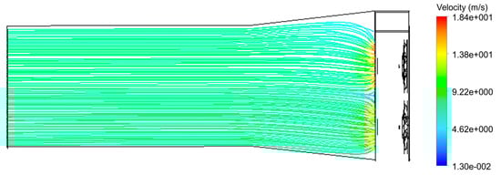 The airflow velocity streamlines are shown in Figure 7 by investigating the airflow in the intake airway. We can see that the velocity is distributed evenly under the assumption of the uniform flow structure at the inlet, and the velocity is increased near the fans’ entries due to the fluid sudden shrinkage. Therefore, the inlet shock losses are primarily caused by sudden shrinkage or expansion of the airway, and the flow characteristic can be interpreted by the one-dimensional flow theory; so the inlet shock losses can be written as [].