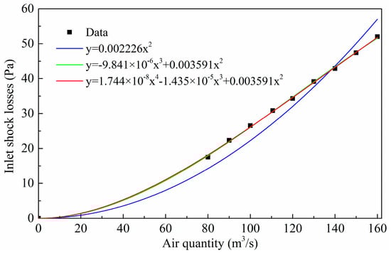 where is the inlet shock loss, is the Atkinson’s resistance converted by the inlet shock loss factor; and ; therein , , are the inlet shock loss factor, air density and tunnel cross-sectional area, respectively. The curve of “” and polynomial fitting curves are depicted in Figure 8, to determine when the air quantity is 110.56 m3/s in the PFS.